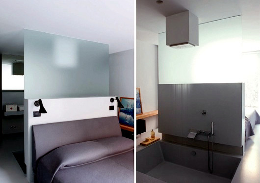 I fell for the mezzanine and arty atmosphere of this modern loft with brick walls and pastel colors in small steps.