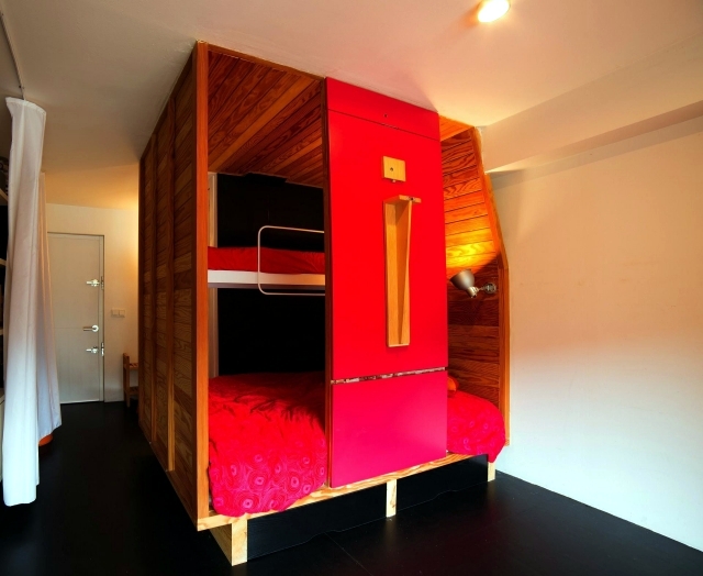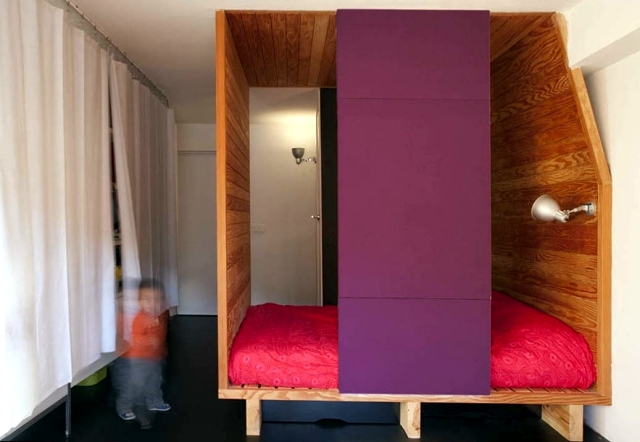 The flooring in the small apartment was redesigned with a black linoleum, which in combination with wood and bedding bright red for a warm atmosphere. You may think that there is something to lose vital and a good cook. The small kitchen and storage space are hidden behind long curtains.