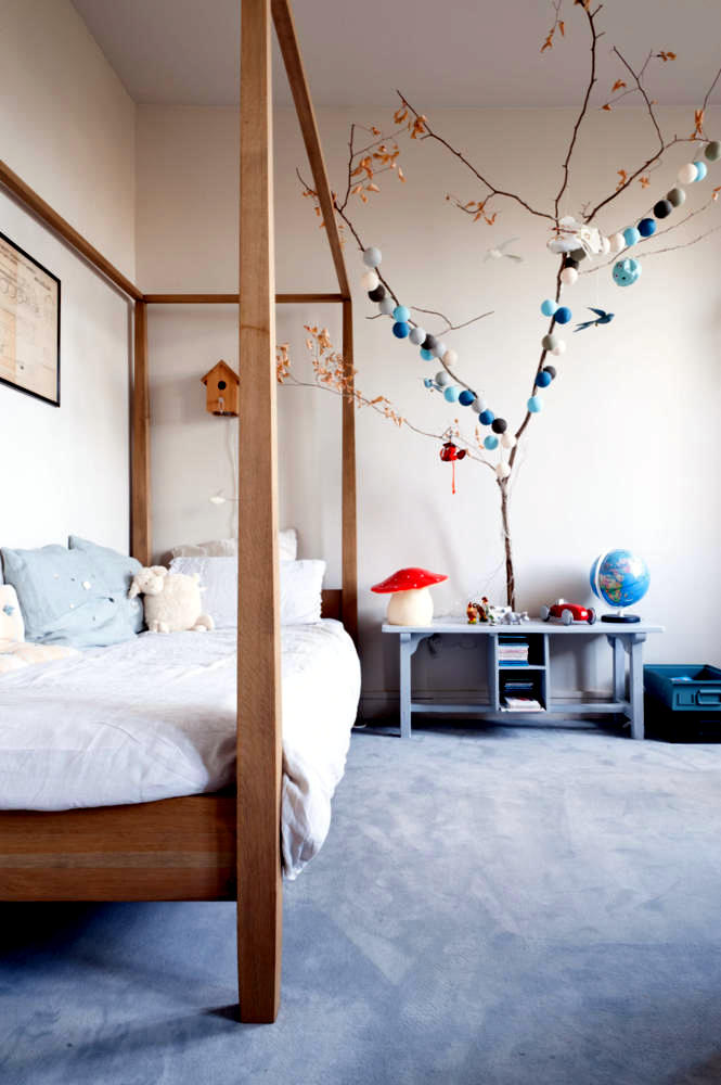 A small tree in the room is so decorative – everything great is that you can connect all kinds of him Dekokrams colorful tassels, garlands and bows decorate the nursery. In every season, you can get away with something new and will always work, of course, with the canopy bed in wood.