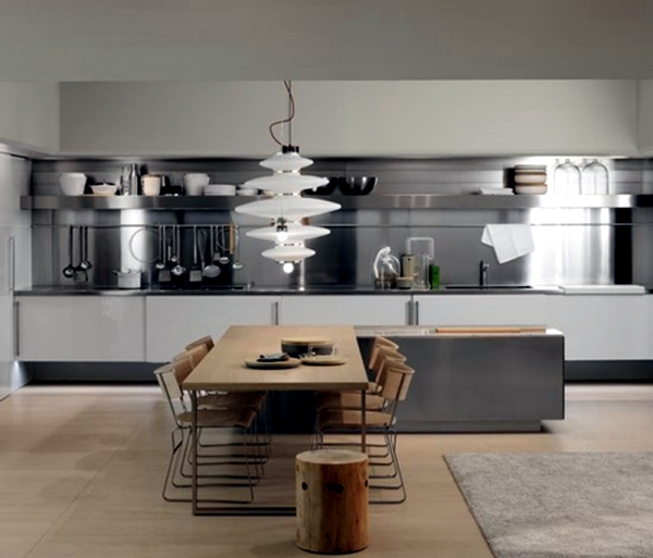 The modern stainless steel kitchens are a timeless classic. Our first tip is fully encased in steel kitchen – the metal surfaces of drawer cabinets. You can combine steel with aluminum chairs and bright colors. Kitchen cabinets and stainless steel drawers create beautiful contrasts, when combined with wood surfaces, tile and marble.
