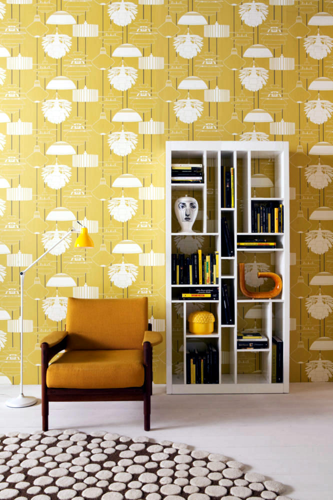 The pattern of wallpaper with paper drawings of yellow light is an extraordinary eye-catcher. The streetlight in front of the wall takes up the theme and created in collaboration with the yellow chair, the carpet and the library an authentic retro look.