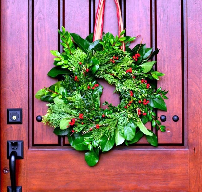 Even beginners can design this simple Advent wreath for the door. Branches of evergreens and red berries are perfect for the winter season and would welcome your friends and the warm and friendly atmosphere. You can use this fresh wreath and hang it above the fireplace or in any other part of the house. Lemon leaves, blueberries, cedar and boxwood branches just add it at the moment and the bright red holly berries fit perfectly. These you can find at any florist, 5-10 stems should be enough for a crown. You need a white crown shears 8 inch metal tape, stapler, hammer.