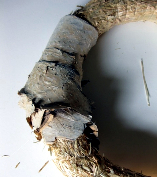 Our idea of autumn decoration is connected with the transition to the winter season. With buds on green leaves creates the feeling of early autumn, even though winter is almost here. To be able to manipulate a ring hammer, you need the following materials: bark, straw, scissors, hot glue gun and decorative paper. First, determine the size of the ring, allowing you to determine the length of the strips of bark. Customize a form of circular base of straw. Cut or tear strips of bark with a width of at least 4 cm to 12 cm. Cover the bottom of the wreath form with ribbons. Place the pieces of bark from the bottom and put the crown straw, so it is in the center. Fixing them all the ends of the strips with hot glue gun, so that the crown appears aesthetic.